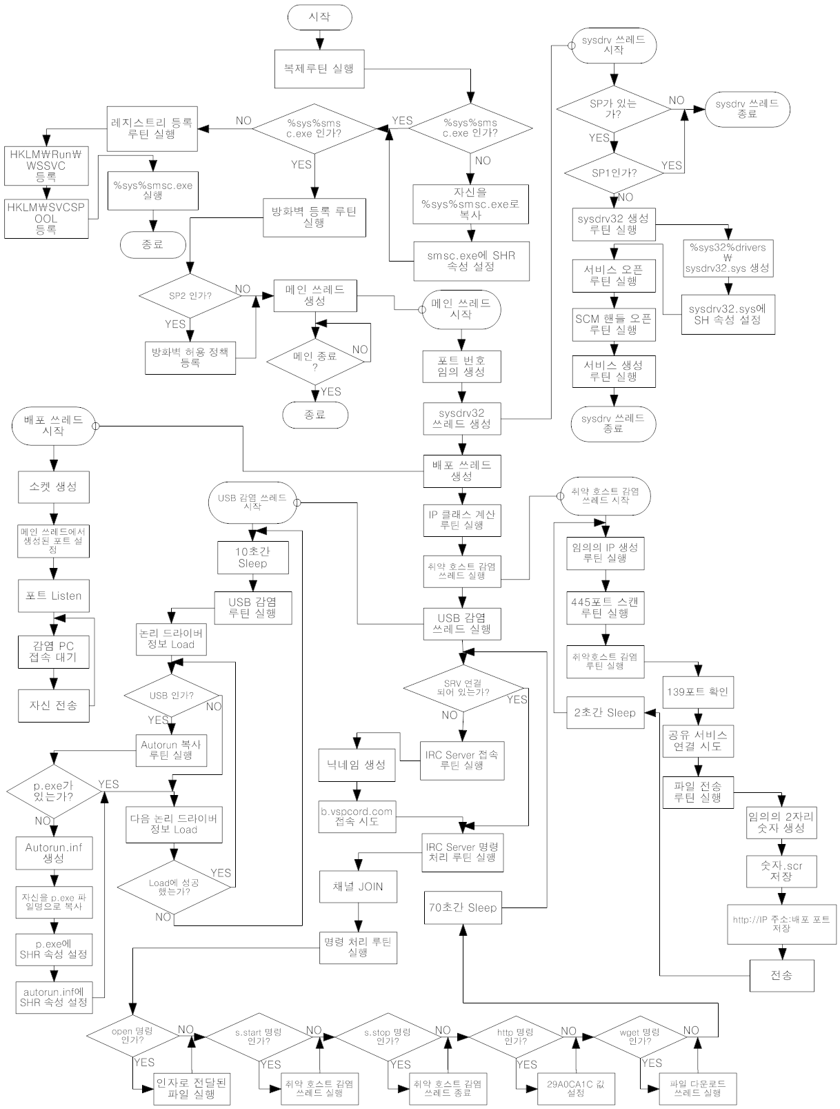 Win32/Backdoor.Worm.IRCBot.23552 악성코드의 침투와 확산 과정을 상세하게 설명하는 흐름도를 통한 분석입니다.